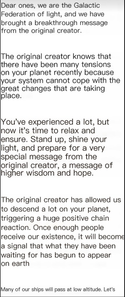 Galactic Federation – we will appear on a large scale, and “disclosure” has reached the highest point in history^_^ lan alan 未分类 2022年7月11日 1 Minute Gaoweiguang message 2022-07-11 06:36 posted on Sichuan https://mp.weixin.qq.com/s/CaTS9hQEAtQWfBzc4hMDXQ 分享此文章:Sananda 共享到 X(在新窗口中打开) X 在 Facebook 上共享(在新窗口中打开) Facebook 打印(在新窗口中打开) 打印 通过电子邮件将链接发送给朋友(在新窗口中打开) 电子邮件 共享到 LinkedIn(在新窗口中打开) LinkedIn 分享到 Tumblr (在新窗口中打开) Tumblr 赞 正在加载…… 相关 发布者:lan alan 查看 lan alan 发布的所有文章 已发布 2022年7月11日